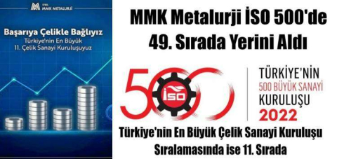 MMK Metalurji, İstanbul Sanayi Odası (İSO) tarafından açıklanan “Türkiye'nin 500 Büyük Sanayi Kuruluşu” 2022 yılı raporunda ilk 500 sanayi kuruluşu arasında 49. Türkiye'nin En Büyük 53 Çelik Sanayi Kuruluşu arasında ise 11. sırada yerini alarak büyük bir başarıya imza attı.