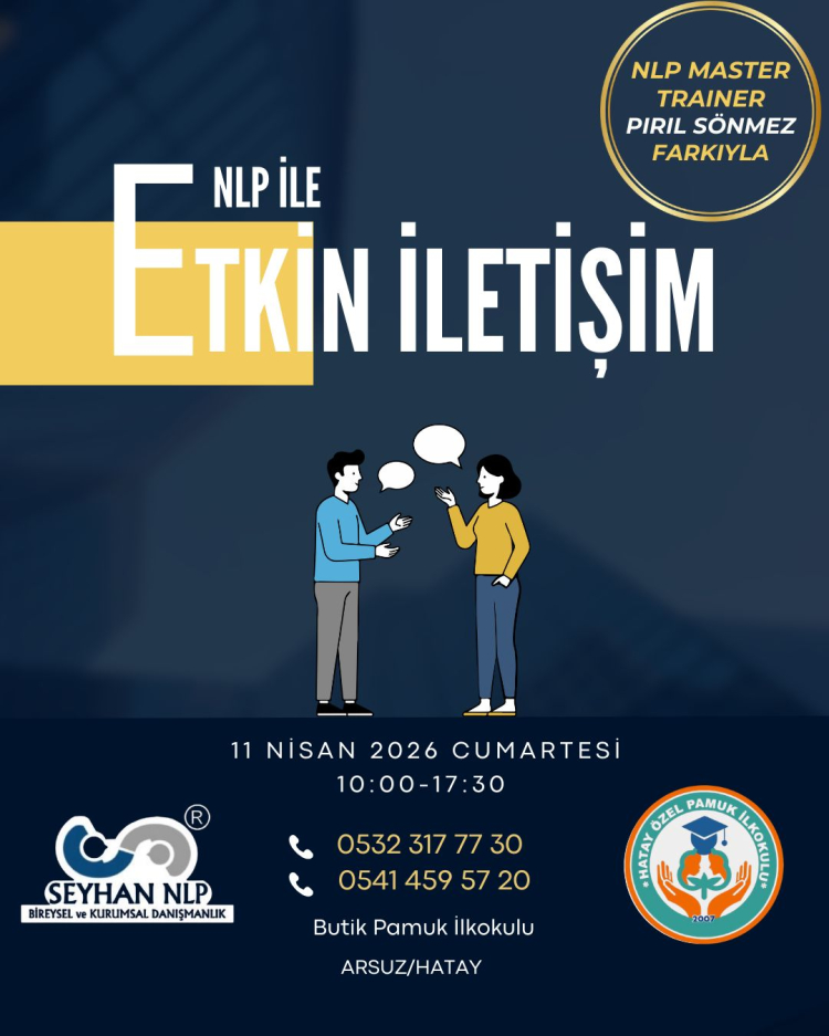 Seyhan NLP Bireysel ve Kurumsal Danışmanlık ile Hatay Özel Pamuk İlkokulu iş birliğinde, bireylerin kullandıkları dil ve sözcüklerin davranışlarını nasıl şekillendirdiğini ve bunun yaşam deneyimlerine etkisini fark etmelerini sağlamak, katılımcıların önce kendi iç iletişimlerini güçlendirmeleri, ardından aile, arkadaş ve iş hayatındaki ilişkilerinde daha etkili iletişim kurabilmeleri amacıyla 11 Nisan 2026 Cumartesi günü Adana'da 10.00-17.30 saatleri arasında bir seminer düzenlenecek.