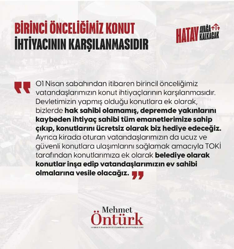 Cumhur İttifakı Hatay Büyükşehir Belediye Başkan Adayı Mehmet Öntürk, HBB olarak önceliklerinin 15 ilçedeki vatandaşların konut ihtiyacını karşılamak olduğunu kaydetti.