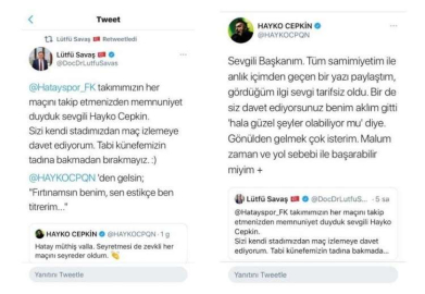Savaş ve Cepkin’in bu eğlenceli ve samimi gönderilerinin altına binlerce yorum ve beğeni geldi. Lütfü Savaş’ın davetini incelik olarak değerlendiren ve Hayko Cepkin’in bu davete icabet edeceğini yazan kullanıcı da vardı, Cepkin’i evine içli köfte yemeye davet eden de. Hataylıların ve Hataysporlu taraftarların retweet ettiği paylaşımlar Twitter’da keyfli anlara sebep oldu.