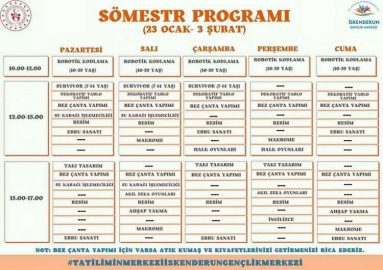 İskenderun Gençlik Merkezi Müdürü Ahmet Keskin ‘Her yıl gençlerimizin verimli bir tatil geçirmeleri amacıyla yarı yıl tatil planı oluşturan İskenderun Gençlik Merkezimiz bu yıl aileleri de programa dahil etti. Çocuklar survivorda kıyasıya mücadele ederken anne-babalar, abi ve ablalar ise dekoratif tablo yapımı, bez çanta dikimi, makrome, takı tasarım, ahşap yakma, ebru sanatı, su kabağı işlemeciliği gibi çalışmaların yapılacağı workshop masalarında verimli vakit geçirme fırsatına sahip olacaklar. Tatilimin Merkezi İskenderun Gençlik Merkezi diyerek başlattığımız yarıyıl tatil programımız kapsamında gençlik merkezimizin kapıları 7 yaş üzeri herkese açıktır.’ şeklinde açıklama yaptı.