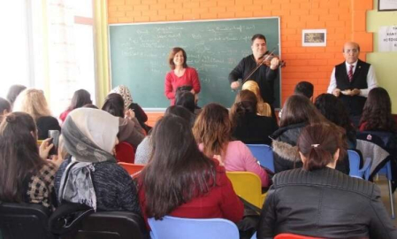 Keman çalarak içeriye giren musiki derneklerinin müzik hocası, şef Murat Bulut’u gören öğrenciler önce şaşırdılar, ardından birbirinden güzel şarkılara neşe içinde eşlik ettiler.