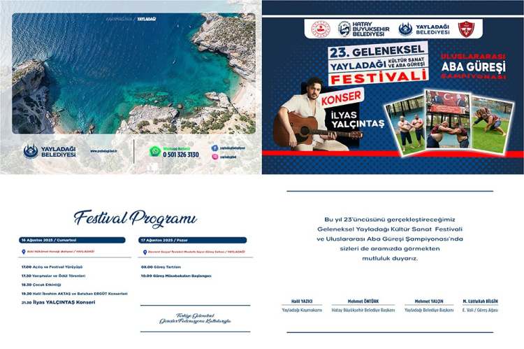 Hatay Büyükşehir Belediyesi ve Yayladağı Belediyesi iş birliği ile bu yıl 23.’sü düzenlenecek olan Geleneksel Yayladağı Kültür-Sanat ve Aba Güreşi festivali birbirinden keyifli ve renkli etkinliklerle başlıyor.